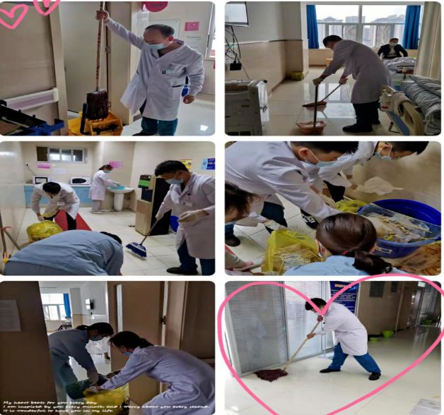 此时高铭作医生说:“垃圾日产日清,是防止疫情蔓延扩散的重要环节。今天不及时清理,明天又会有新的垃圾,这样细菌滋生更快,创造清洁干净的环境是我们目前要做的,疫情不走,我们就一直坚持!”高医生充分发挥党员模范带头作用,率先垂范,勇于当担、无私奉献的精神,感染了科室所有人,于大家纷纷赞同道:“是啊,在关键时刻,如果你不做,我也不做,那么这个工作谁来做呢?”于是他们没有退缩,不怕脏,不怕累,趁午休时间,立即开展病区大扫除,他们认真打扫,不放过任何一处死角,用扫帚保护好战“疫”前方,切断污染源,降低了风险感染率,为患者提供一个舒适的环境!