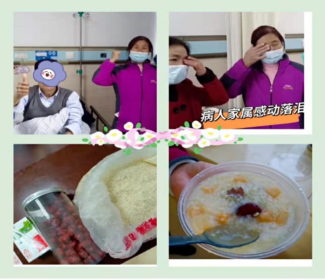 为此,护士长立即号召科室人员积极解决,她托自己家人带来锅具、食材,解决饮食困难患者的吃饭问题。科室下夜班的护士,自发每天下午,轮流为患者精心熬制“红枣爱心粥”,挨个分发给他们。“谢谢了,真是谢谢你们了,感谢感谢!”这些朴实的语言,是我们收到的最多的表达,甚至有的家属感动落泪,而这份感动也是我们每天坚持的动力!