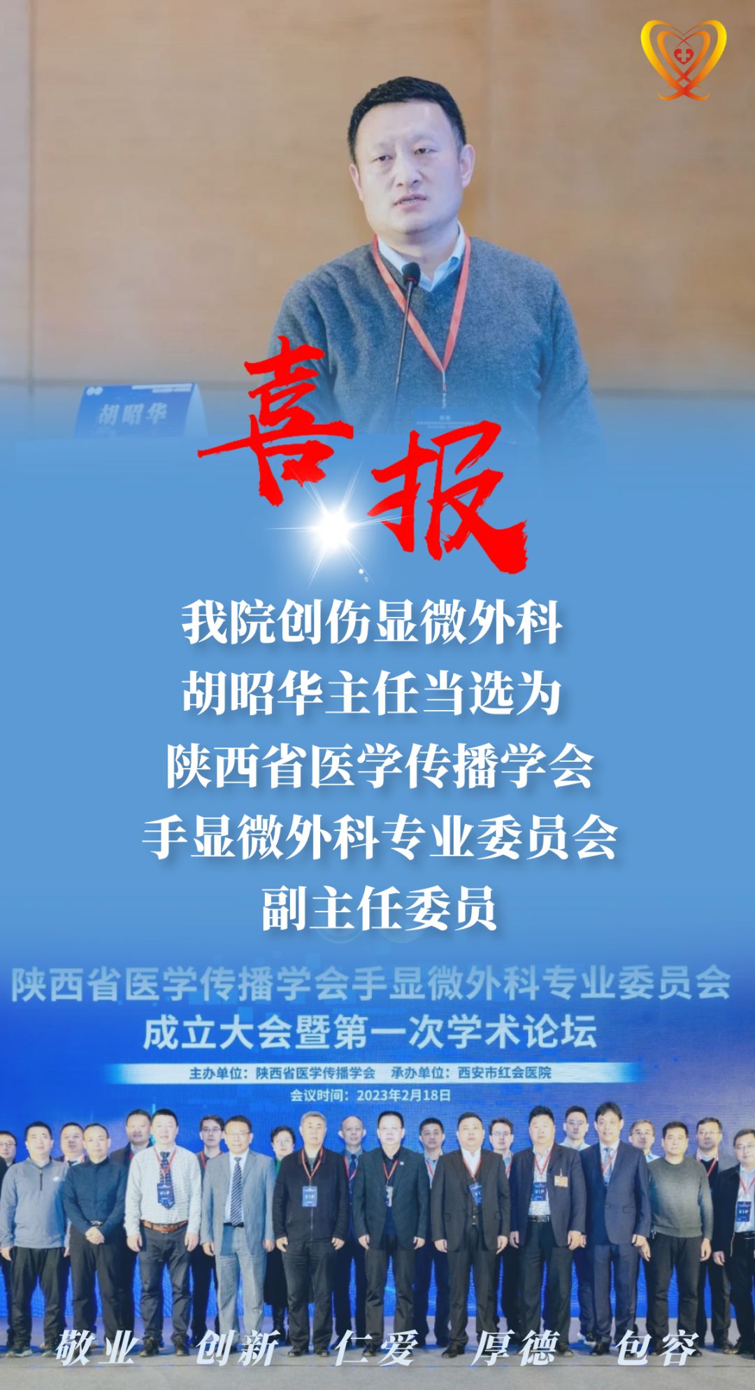 2月18日,陕西省医学传播学会手显微外科专业委员会成立大会暨第一次学术论坛在西安顺利召开。本次大会由陕西省医学传播学会主办、西安市红会医院承办。陕西省医学传播学会会长王维君,陕西省医学传播学会副会长、西安市红会医院党委书记柳明,陕西省医学传播学会秘书长杨俊超,中华医学会显微外科分会候任主委、中国人民解放军联勤保障部队第九二〇医院骨科医院院长徐永清教授,山东省立医院手足外科主任王增涛教授,宁波市第六医院王欣副院长,中山大学谢志教授,空军军医大学西京医院丛锐教授,兵器工业五二一医院郭永明院长、滕云升副院长,西安市红会医院手外科学科带头人许玉本主任,西安市凤城医院王保山院长等领导、专家出席大会。