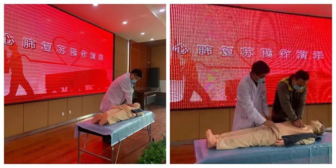急诊科护士长岳银涛现场演示心肺复苏。为了便于现场掌握,大家积极踊跃参与心肺复苏操作练习。