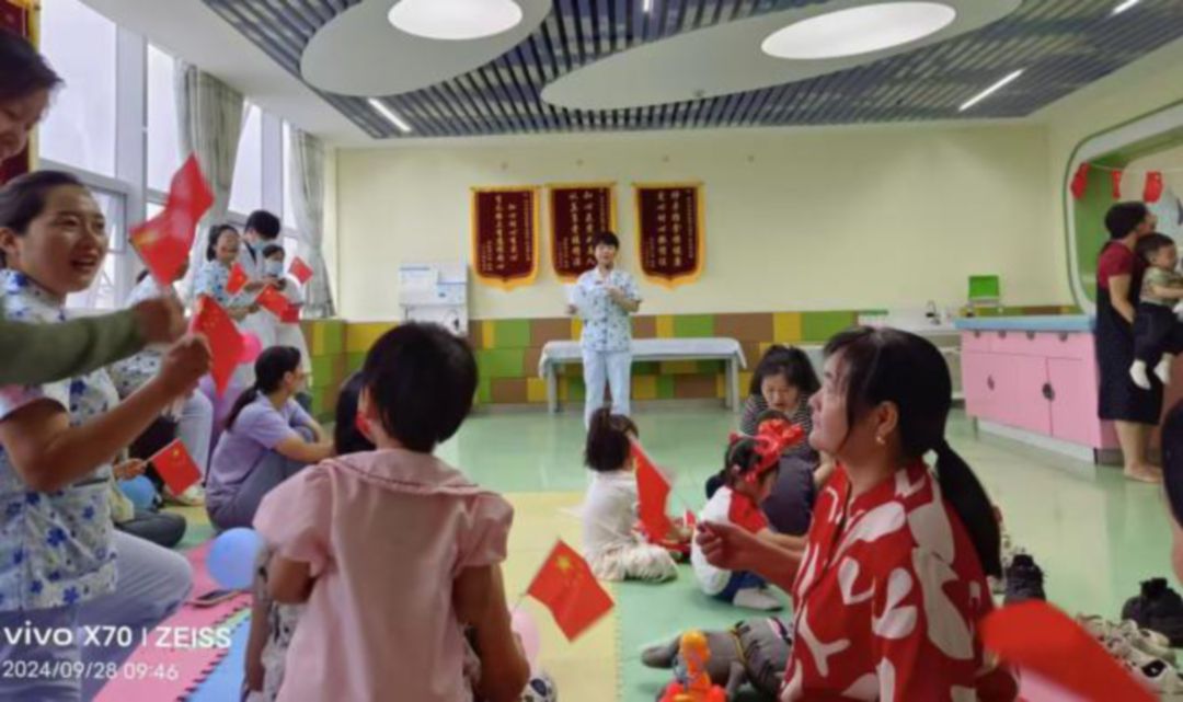 9月28日上午,儿保科歌声悠扬,红旗飞舞,活动拉开了帷幕。首先由儿保科郭小春主任致辞。今天我们不仅仅是在庆祝祖国的生日,更是在这特别的日子里,搭建起一座爱的桥梁,让亲子间的情感在欢笑与互动中更加深厚。亲子活动,是爱的传递,是成长的见证,它让我们在忙碌的生活中找到片刻的宁静,共同享受那份纯真的快乐。