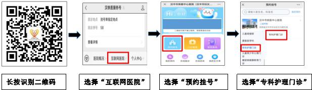 方式一【网上预约】:点击大图长按识别进入“汉铁医服务号”小程序→互联网医院→预约挂号→专科护理门诊。