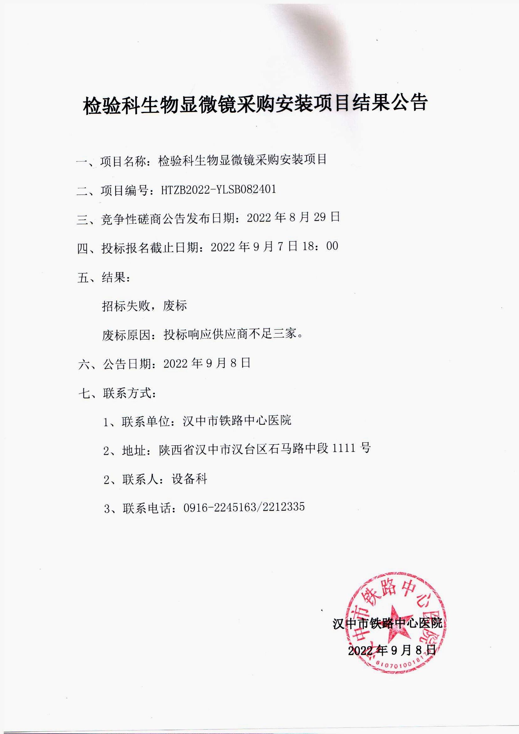 检验科生物显微镜采购安装项目结果公告