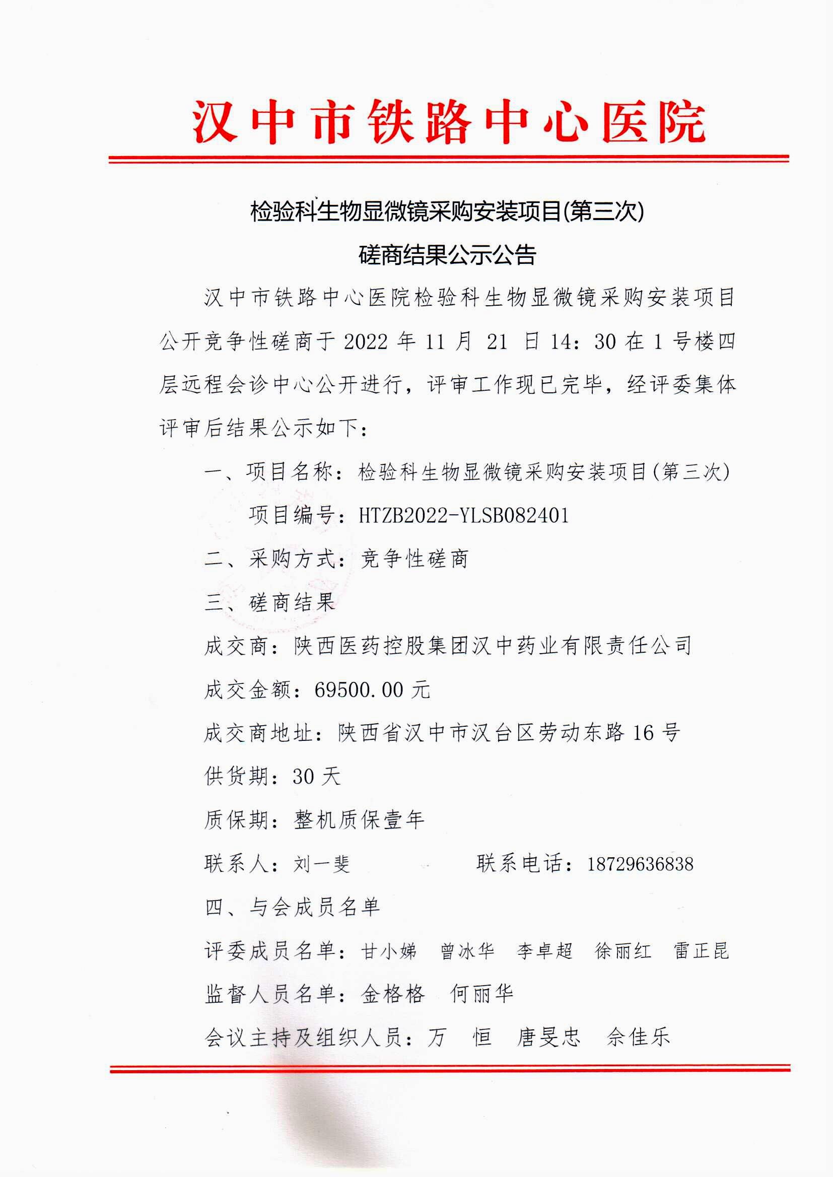 检验科生物显微镜采购安装项目(第三次)磋商结果公示公告