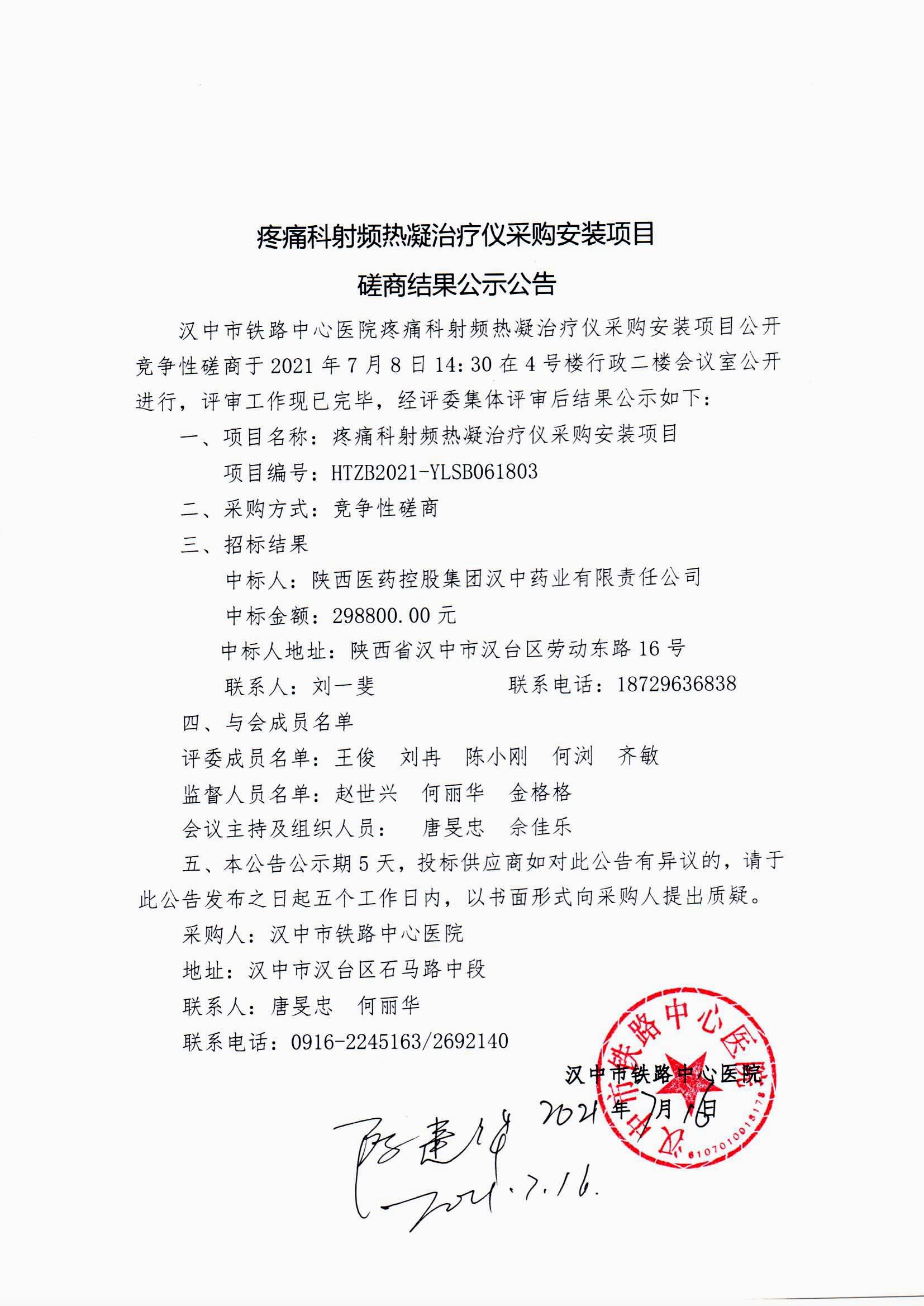 疼痛科射频热凝治疗仪采购安装项目磋商结果公示公告