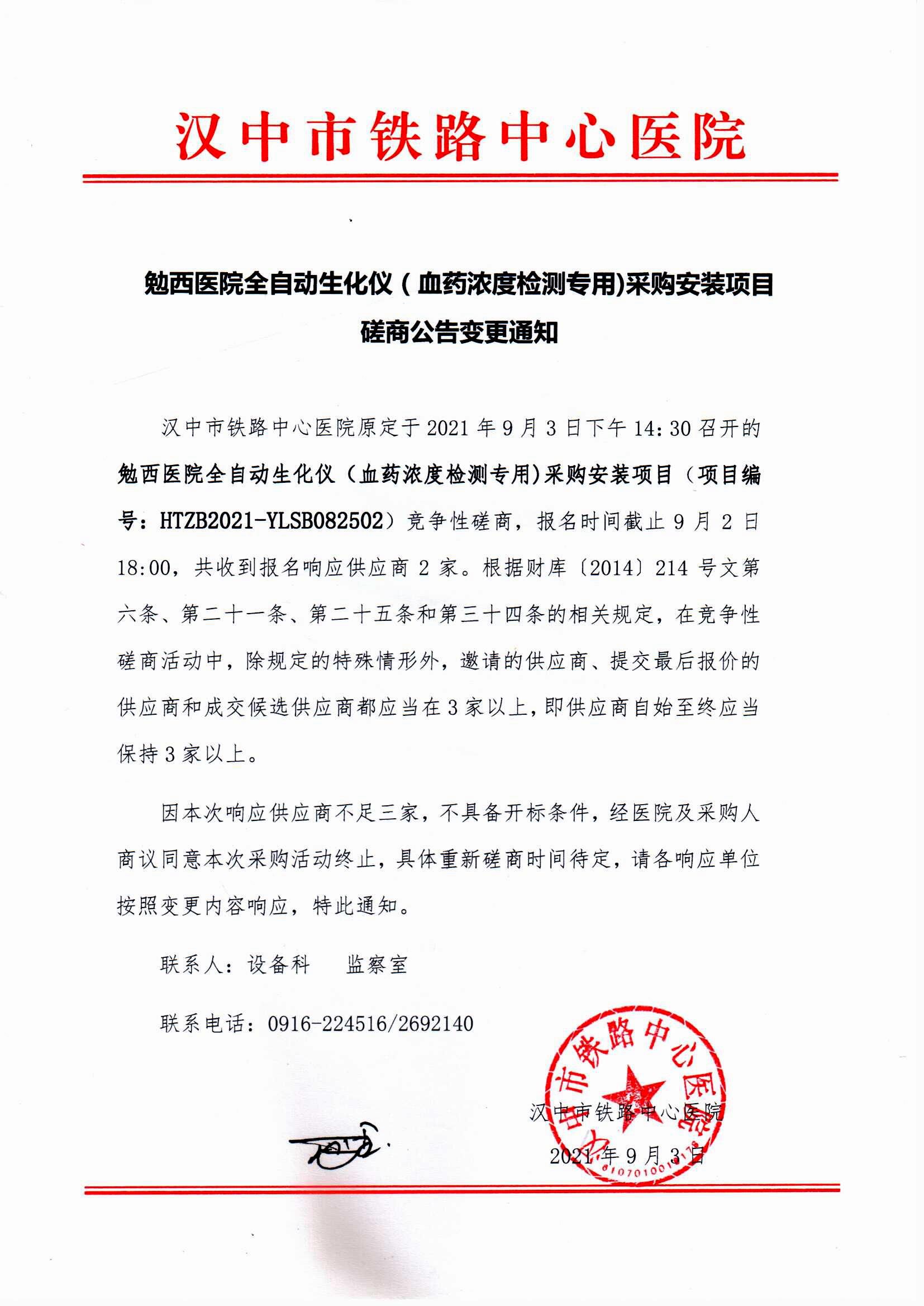 勉西医院全自动生化仪(血药浓度检测专用)采购安装项目磋商公告变更通知